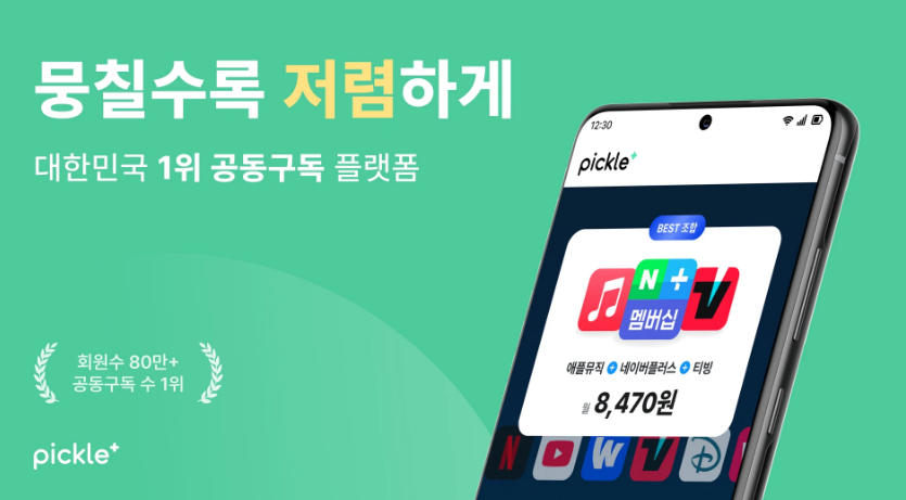 피클플러스는 넷플릭스, 디즈니+, 티빙, 웨이브, 애플뮤직 등 다수가 함께 사용할 수 있는 구독 서비스를 중개하는 플랫폼입니다.